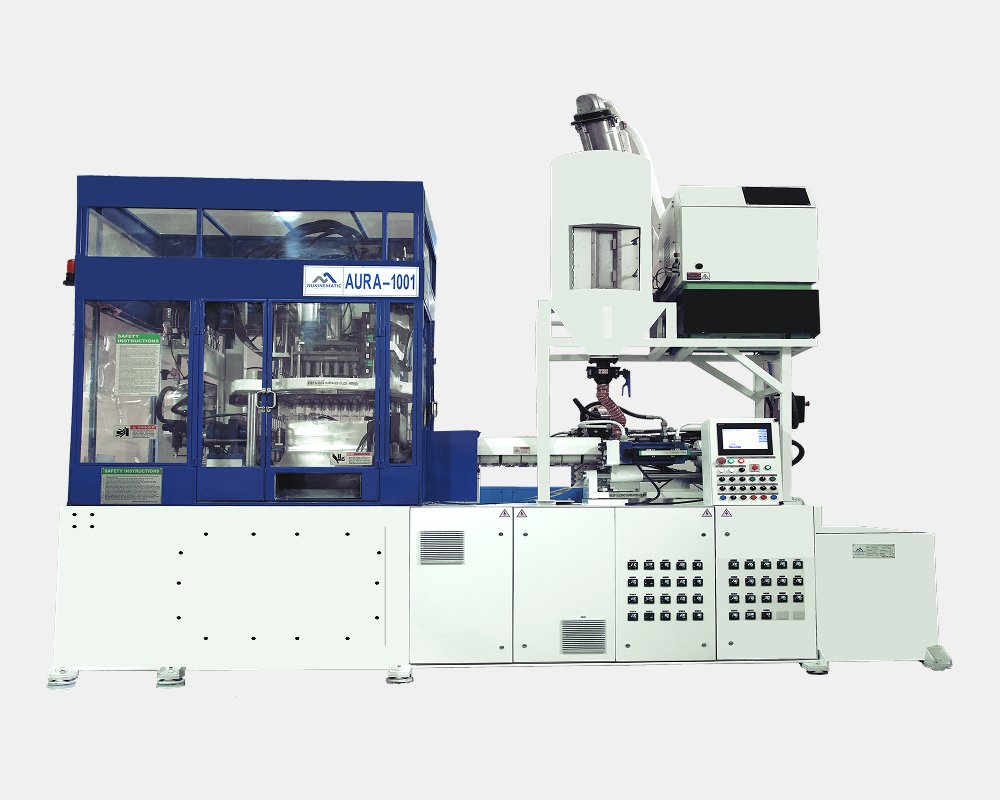 The AURA-1001 | Single-Stage Blow Moulding Machine is a fully automated system that combines injection moulding, preform conditioning, and blow moulding into a single streamlined process. Designed for touch-free and contamination-free production, it ensures superior bottle quality, clarity, and dimensional accuracy with minimal energy consumption.